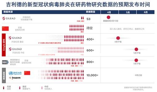 “我们期待在适当的时候看到公布的数据。我们预计五月份获得有安慰剂对照的NIAID试验的初步数据,以及吉利德的针对中度症状新型冠状病毒肺炎患者的研究数据。”