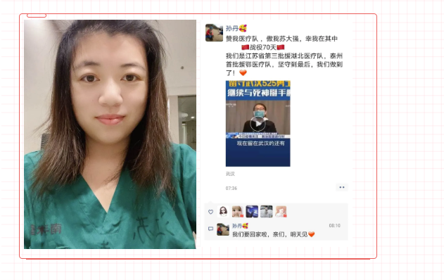 出征时,孙丹和战友特地准备了国旗,为的是回家的时候高高扬起。看到回家的战友们挥舞着国旗奔向自己的亲人,载誉而归,孙丹忍不住想,那会是怎样一种感动?“看到电视里,国家卫健委有关人员说,留在武汉的还有江苏两支队伍,各负责一个ICU病房,那种自豪感……”孙丹庆幸自己是其中的一员,此生无悔。 挥舞着国旗载誉归来为你们自豪欢迎回家!
