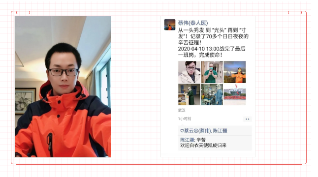 1994年10月出生的蔡伟,是泰州市人民医院ICU的一名男护士。“出征”前,为更好地完成工作,帅帅的他特意理了个光头。眼下,已长成茂密的“板寸”嘞。