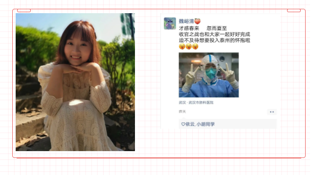 武汉之“旅”,是26岁的张蓉第一次离家这么久。在泰州,她是爸妈眼里永远长不大的“大孩子”,是年迈外婆的“乖乖肉”。“武汉,让我学会了成长,学会了为生命拼命。”张蓉为自己自豪。