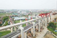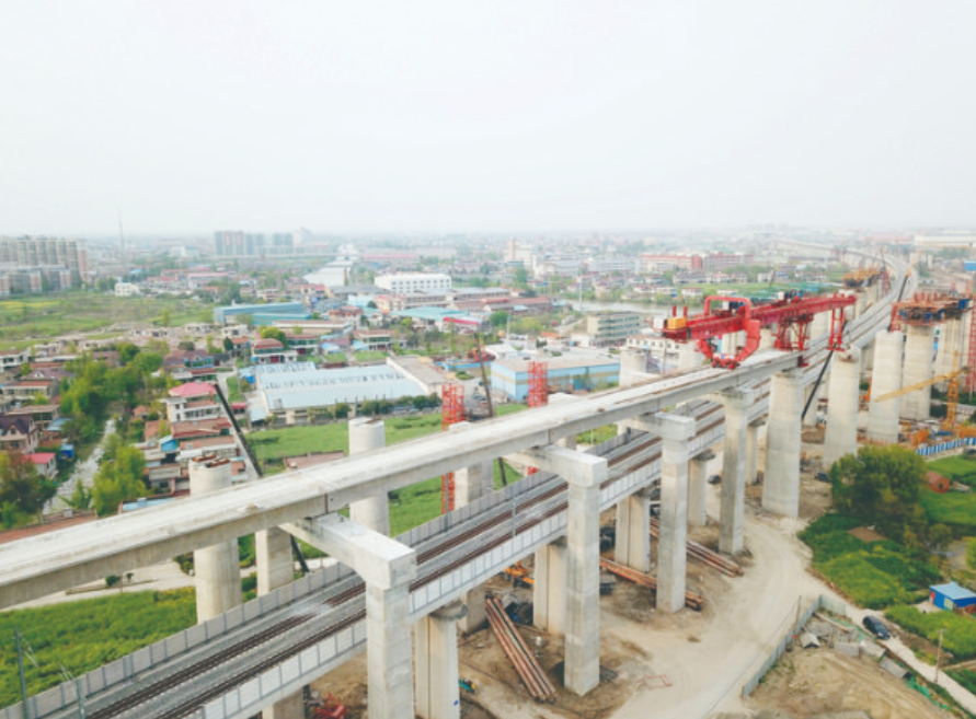 4月10日,随着一榀长24米、重364吨的单线箱梁稳稳落在盐通铁路通张段跨沪通铁路55号至56号门式墩之上,该铁路抢在沪通铁路联调联试前完成上跨架梁施工(右图 胡琦摄),为全线架梁通道畅通打下坚实基础。