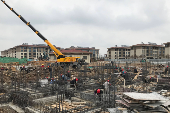 在徐圩新区香河新村二期项目施工现场,塔吊林立,300多名工人正在绑扎钢筋、砌筑围墙,挖掘机在挖掘渣土,工程车来回穿梭,一派火热的建设场景。目前,项目正在进行项目基础工程,等到下个月进入主体工程建设时,现场工人将达到700多人。