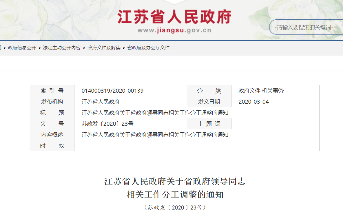 我苏网讯 4月13日,江苏省政府网站公布省政府领导同志相关工作分工调整。详情如下: