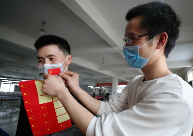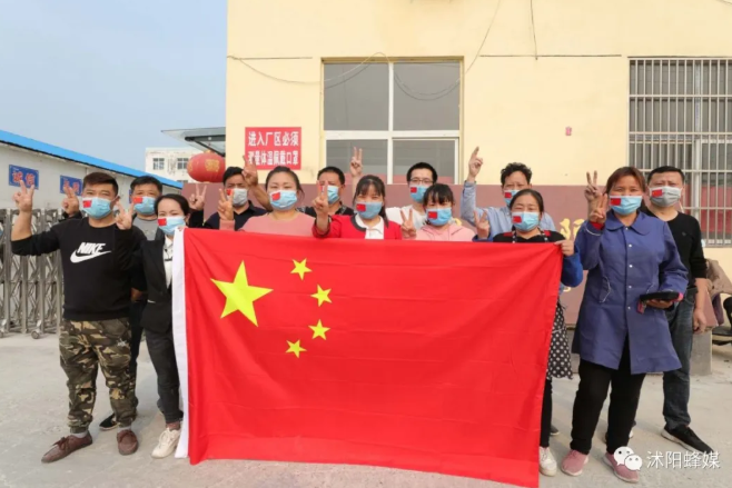 近日,在沭阳县塘沟镇工业集中区的江苏东泰运动用品有限公司,来自湖北省孝感等地的13名工人喜不自禁:他们把专门精心制作的小国旗贴在彼此的脸上,并在厂区门前与国旗合影留念,以此庆贺疫情防控以来正式上班,表达复工的喜悦和对祖国的热爱之情。