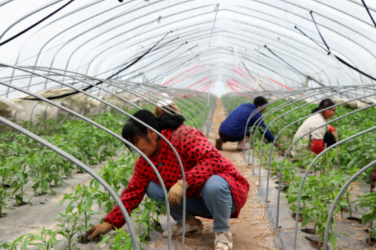 近日,在陶营村土地耕作服务社的大棚内,几名农户正在为刚刚栽种的红椒秧苗除草。农户姜淑珍说:“现在土地流转给了村集体,我一边拿着土地租金,一边在合作社里做农活赚钱,每年收入能达到1万多,生活条件比以前好多了。”