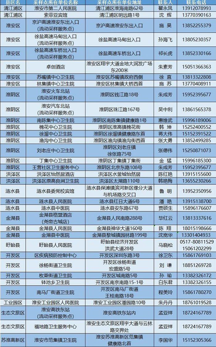 根据省、市新冠肺炎疫情防控工作统一部署,为做好来淮返淮人员的采样检测服务,淮安市设立35个采样服务点。现将设置情况公布如下: