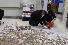 4月11日晚上11时许,下关派出所民警巡逻至三台洞船舶基地码头附近水域时,发现一男子划着2平方米大小的泡沫划子在江边收地笼网。为了保障嫌疑人人身安全,查清非法捕捞的犯罪事实,现场民警没有当即抓捕,在江边耐心守候。直到4月12日凌晨3时,经过4个小时,该男子在沿岸线200米的区域收起共计27条地笼。当该男子上岸时,民警当场将其控制并查获5袋渔获物。经清点,小虾3000余条,小螃蟹62只,昂刺鱼72条,另外还有刀鱼、鲶鱼、鳝鱼、鲫鱼等其他各类鱼种数十条。