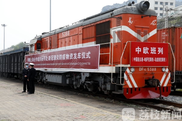 “捐赠上海合作组织秘书处新冠肺炎防疫物资现在发车!”随着连云港港口集团总裁朱向阳的一声令下,搭载着26万件防疫物资的连云港国际班列缓缓出发, “‘一带一路’守望相助 上合同心”的横幅随风飘起,将温暖与牵挂,带向万里之外的异国友邻。
