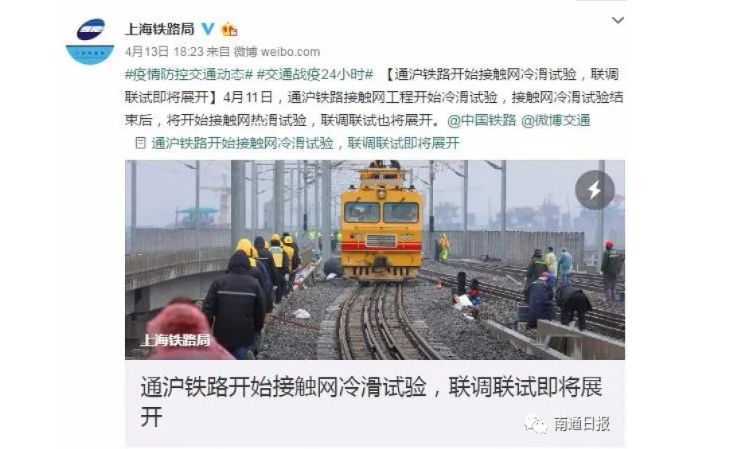 接触网成功送电首座牵引变电所受电启动……近日,沪通铁路建设连续取得多项进展!昨天(4月13日),上海铁路局官方微博发布了一篇题为《通沪铁路开始接触网冷滑试验,联调联试即将展开》的博文,在回复网友咨询的时候,上海铁路局称“现在改名通沪了”。发布君向南通市铁路办求证,这一消息属实!