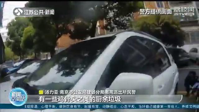 南京市公安局建邺分局南苑派出所民警汤力亚介绍,车辆周围包括地面上和车身上有鸡骨头之类的厨余垃圾,在现场还找到了一个外卖盒,上面张贴了外卖的单子。