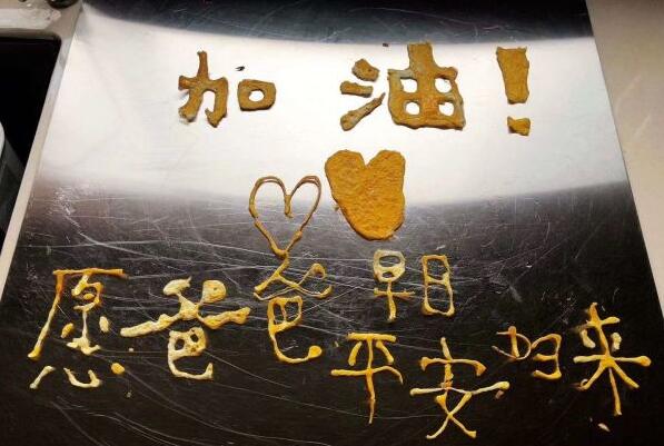 2月28号早上,章文豪在武汉支援时,收到了一份特殊的“云早餐”。从不下厨房的儿子,摸索着,用面粉、鸡蛋,拼成了一行字:"加油!愿爸爸早日平安归来!"
