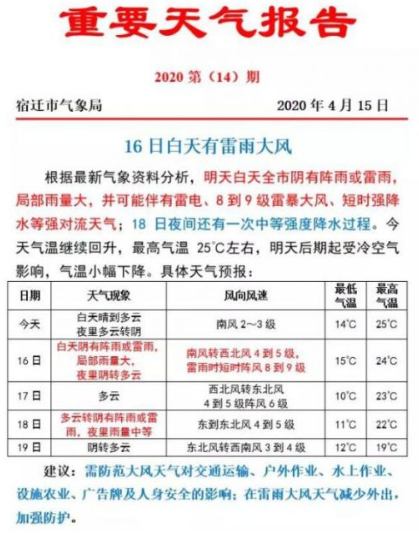 记者从宿迁市气象部门了解到,接下来,天气君就要放飞自我了。“作妖”的天气主要集中在周四,当天将有雷雨大风,并可能伴有雷电、8到9级雷暴大风等强对流天气,需防范大风天气对交通运输、户外作业、水上作业、设施农业、广告牌对人身安全的影响。同时,周六多云转阴有阵雨或雷雨,夜里雨量中到大。本周中后期受冷空气影响风力增大至5到6级,气温将有小幅下降。