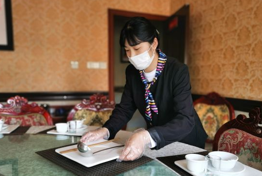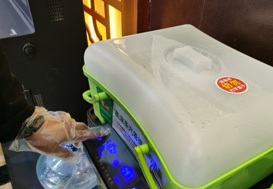 “嘀……嘀……”在大厅一台全智能蒸汽消毒机前,服务员按响开关按钮。数分钟后,服务员打开消毒篮,取出公筷公勺,放在盘子上,送至包间。