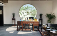 大厅的背景墙上有一块大圆玻璃,春天的暖阳下,阳光会洒进来,透过玻璃看窗外的景色一片翠绿生机的样子,是新中式的风格,是完美借景,也是很适合食客前来打卡的样子。