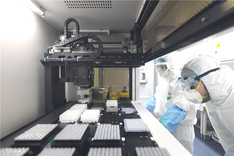 Doctors test novel coronavirus samples with BGI's kits at a lab in Wuhan, Hubei province. [Photo by Zhou Chao/For China Daily]