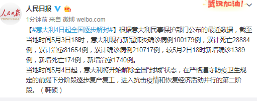 根据意大利民事保护部门公布的最近数据,截至当地时间5月3日18时,意大利现有新冠肺炎确诊病例100179例,累计死亡28884例,累计治愈81654例,累计确诊病例210717例,较5月2日18时新增确诊1389例,新增死亡174例,新增治愈1740例。