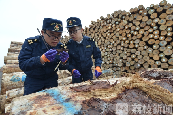 △5月9日,镇江海关关员在镇江新民洲港口对从澳大利亚进口的加勒比松原木进行现场检疫查验。