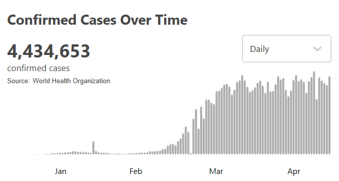根据世卫组织最新实时统计数据,截至欧洲中部夏令时间5月16日18时45分(北京时间5月17日0时45分),全球确诊新冠肺炎4434653例,死亡302169例。