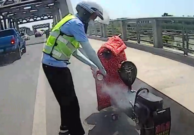 由于地处船闸闸桥,车辆较多,为防止发生交通拥堵,司刚、朱帅先在灭火的同时,对过往车辆和人员进行疏导。在几名辅警的共同努力下,仅仅用了50秒,就快速控制了电动自行车冒烟点,后经查看发现可能是电动自行车电源线路老化所致。
