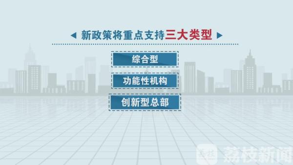 新政策将重点支持三大类型:综合型、功能性机构和创新型总部。符合条件的新引进和现有总部都能获得经营奖励、租金补贴、人才奖励、能级提升和高新技术等奖励。重大项目及创新型总部还能享受“一企一策”、“一事一议”的奖励政策。