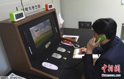 资料图:韩方工作人员通过朝韩联络热线与朝方联系。
