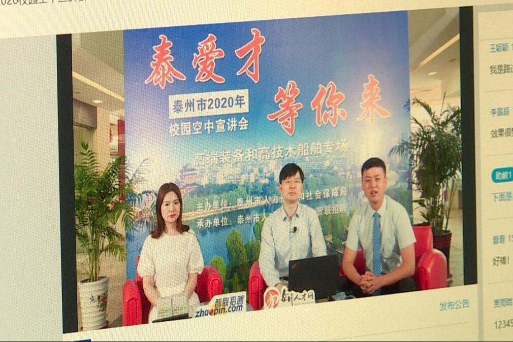 记者从泰州市人力资源和社会保障局了解到,今年4月初,他们便启动了“百日千万网络招聘专项行动”,在其官网——泰州人才网专门开辟就业见习指导、就业创业政策、名企空中宣传、毕业生千企万岗“云”招聘会等多个专区。期间,围绕泰州“生物医药和新型医疗器械、高端装备和高技术船舶、化工及新材料”三大先进制造业集群推出的校园空中宣讲会,吸引了30多所高校的30000多人次毕业生在线观看,2400多名高校毕业生在线向用人单位投递简历。