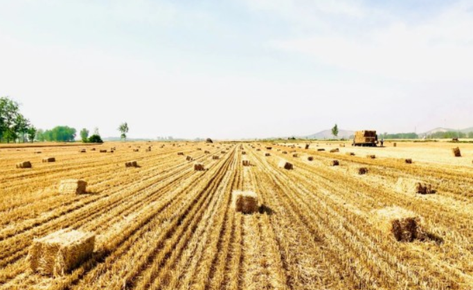 在刚刚收割完的小麦地块中,麦秸秆打捆机在田中缓缓地来回穿梭,田间地头一两个回合后,就会从机体中吐出一个打好的麦秸捆。