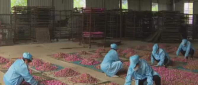 因为鲜花不容易保存,当地成立三家大型玫瑰加工厂,生产玫瑰茶、玫瑰酱、玫瑰饼、玫瑰精油等产品,形成了种植、加工、包装、销售、物流为一体的产业链。
