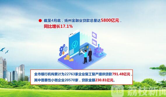 针对当前的金融需求,扬州市各金融机构靶向施策,密集出台了相关惠企政策。先后推出了提额征信、延长还款期限、下降贷款利率、减免服务费用、开通绿色审批通道等一揽子服务政策,为企业提供了稳定的金融支持。截至4月底,扬州金融业贷款总量达5800亿元,同比增长17.1%。全市银行机构累计为22763家企业复工复产提供贷款791.48亿元,其中普惠性小微企业20570家,贷款金额230.81亿元。