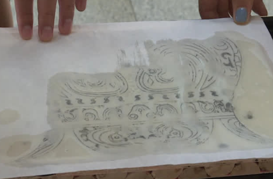 拓片是我国一项古老的传统技艺,使用宣纸和墨汁,将碑文、器皿上的文字或图案,清晰拷贝出来,是记录中华民族文化的重要载体之一。社教员王婷告诉记者,今天拓片的模型是博物馆的青铜凤纹尊,这也是镇江博物馆唯一的国宝级文物。
