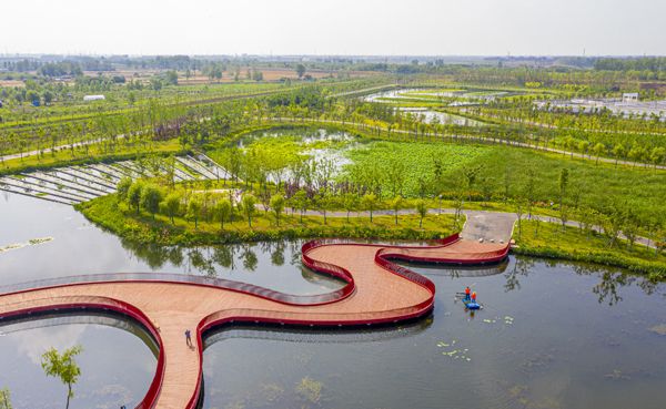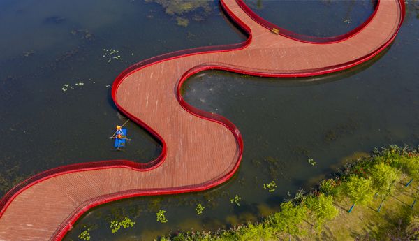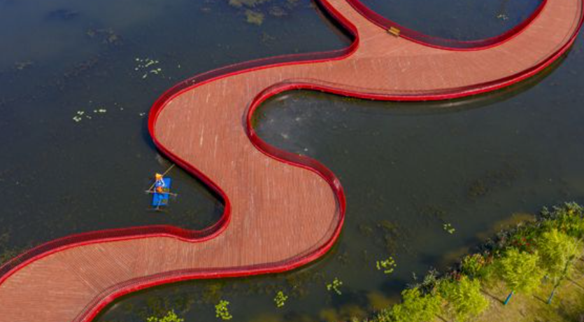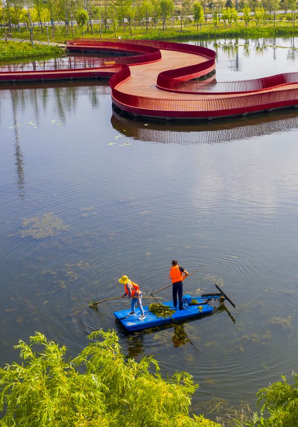 6月11日,泗洪县城北污水处理厂旁的尾水湿地公园风景如画,一座造型独特的彩虹桥似巨龙腾飞,在绿草碧水的映衬下,显得更加鲜艳夺目,成为城区一道靓丽的风景。