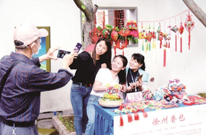 设于徐博乾隆行宫院内的非遗项目展示展销涵盖了传统美术、传统技艺和传统医药类近40项国家级、省、市、区级非遗项目。为期三天的“非遗集市”从早上9时持续到晚上9时。13日这天一大早,徐州香包、下邳蒲扇等非遗项目的传承人带着各自的产品在乾隆行宫的走廊、亭台设下摊位,徐州市文广旅局的对口帮扶单位沛县河口镇共和村带来了新近投产的牛蒡制品。园林中琳琅满目的非遗产品吸引了市民围观采购。