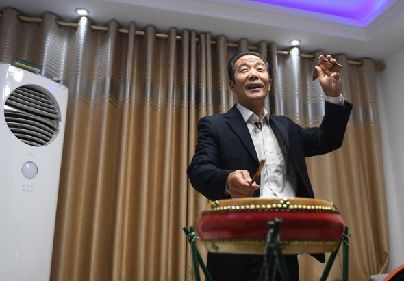 6月12日,在宿迁市宿城区,牛崇祥在家中直播表演苏北大鼓。季春鹏 摄