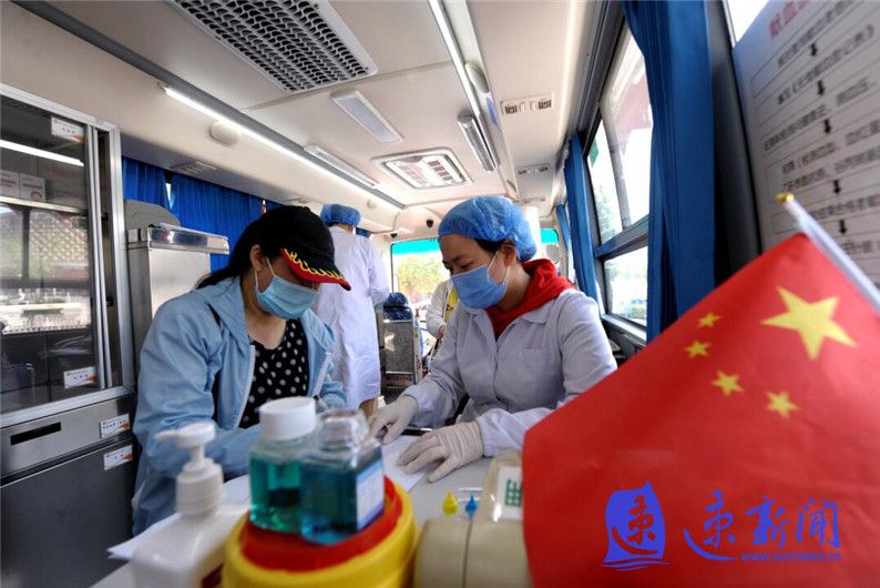 6月14日,在宿迁市区宝龙城市广场、幸福路等处的献血车内,不少市民前来无偿献血。2020年6月14日是第17个世界献血者日,今年的活动主题是“安全血液拯救生命”,口号为“献血,让世界更健康”。(