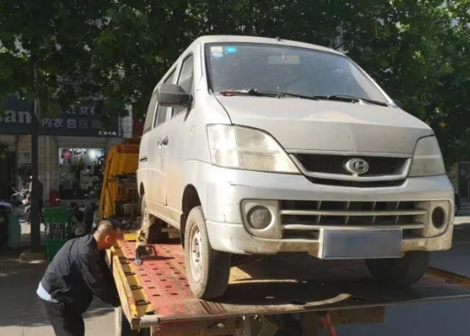 近日,交警支队海州二大队民警在辖区排查时,发现镇海路某超市门前停放一辆号牌为苏GJN***的面包车,四个车轮都已经干瘪,车身落满灰尘。经查询,该车逾期两年未年检,达到报废标准,且还有12次交通违法未处理,据周边群众反映,该车至少停放在此处超过1年。民警在联系不上车主情况下,找来拖车将该车转移到指定停车场。