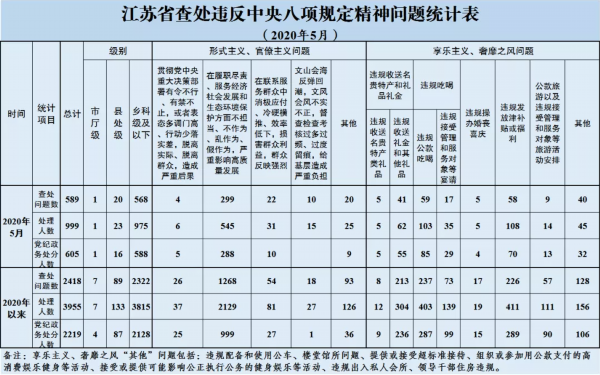 2020年5月,全省共查处违反中央八项规定精神问题589起,处理999人,其中给予党纪政务处分605人。从问题类型看,查处形式主义、官僚主义问题355起、处理622人,查处享乐主义、奢靡之风问题234起、处理377人。从人员级别看,处理市厅级干部1人、县处级干部23人、乡科级及以下人员975人。