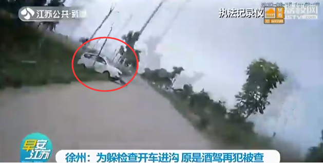 近日,徐州一辆白色轿车遇到交警检查时,突然加速倒车,先是撞上路边的树,随后又倒进了路边的沟里。