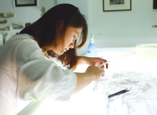 这看似简单的画面效果却有着不简单的制作工艺,实现宣纸透光性的过程也并非一帆风顺。“起初,我期望用颜料来实现一种透光的效果,将丙烯色彩层层叠加堆积成明暗深浅的效果,继而进行创作。但是,丙烯显得粗糙,一些细节并不能较好地塑造。”她说,自己一度陷入材料局限的困惑中,后经过老师点拨,自己开始实验不同的纸张,硫酸纸、拷贝纸、宣纸……逐渐找到最合适的宣纸。