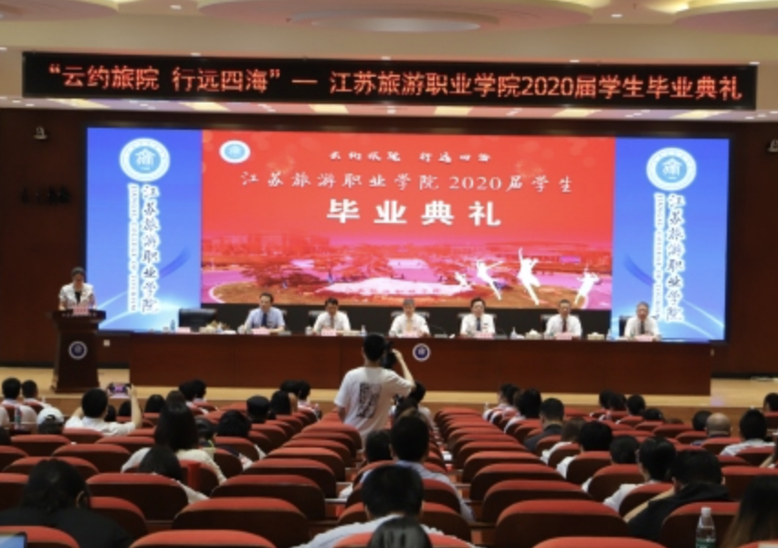 这是江苏旅游职业学院首次采用视频直播方式举行的毕业典礼,线上915名毕业生和线下120名毕业生跨越了时空的阻隔,共同体验了人生的高光时刻。