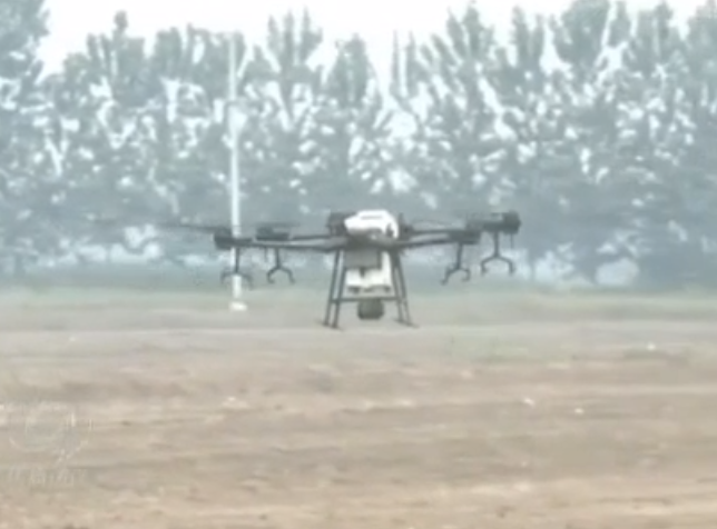 在江苏盐城市建湖县上冈镇树新村,无人机正在田里作业,为下一步播种做准备。村里的这块田有200多亩,刘艾标家的6亩地也在其中,现在整片农田都归刘艾标看管。