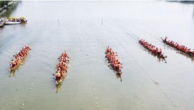 上午9点半,在精彩的民俗表演后,紧张刺激的趣味龙舟赛正式开始。游客们穿上救生衣,在教练的指导下熟悉划船技巧,学习必要的安全知识。不久,游客们便“学满出师”,拿起划桨,向着码头出发。随着一声清脆的哨鸣,龙舟首部的鼓手擂起隆隆战鼓,划手们训练有素、手起桨落,龙尾的舵手沉着冷静,把稳方向。一艘艘龙舟似巨蟒入水,乘风破浪,前行中激起层层浪花。每艘龙舟鼓点越激,船桨挥动越快,队员奋勇争先,龙舟你追我赶。岸边观者不时发出阵阵呐喊声,几分钟后,几艘龙舟胜负已分,首先抵达终点的划手们不禁振臂欢呼,尽情享受团结协作的成果和竞赛带来的乐趣。