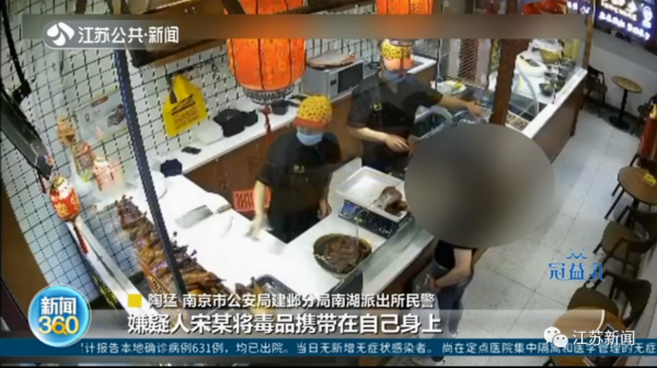 监控中,嫌疑人宋某将毒品带在自己身上,到了熟食鸡鸭店内,通过跟工作人员交谈,不停进出店铺,频繁地把鸡鸭拿过来再还给店员,分散了店员的注意力。