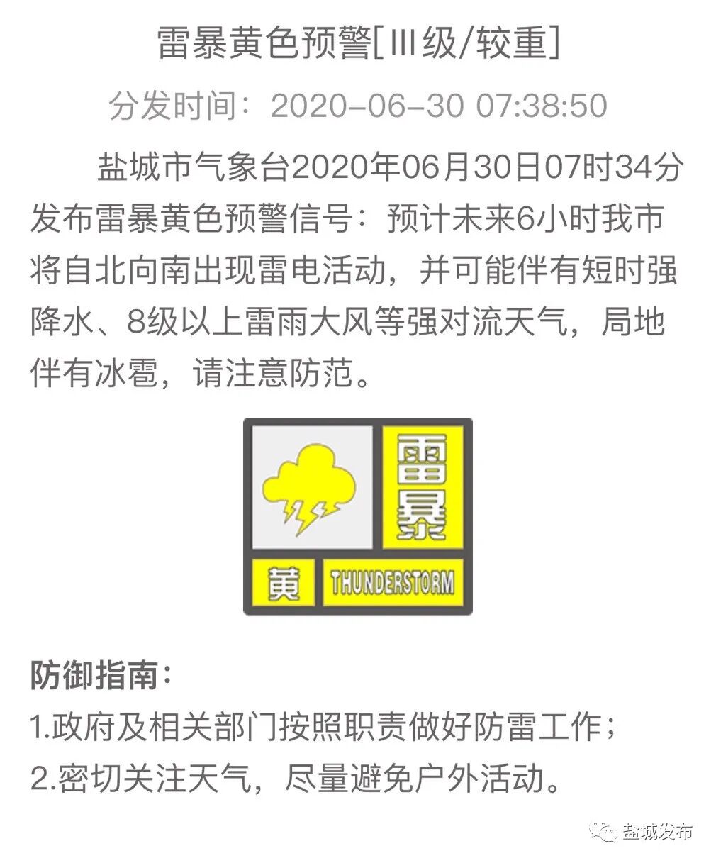 盐城市气象台发布雷暴黄色预警: