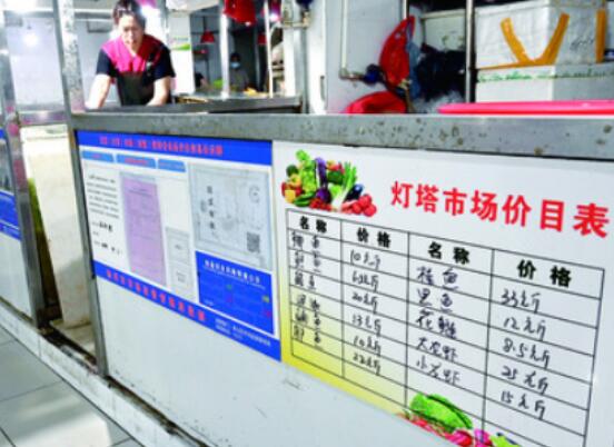 当天,在灯塔农贸市场,蔬菜、水果、肉、禽、蛋等摊位,都悬挂了标价牌,消费者一眼就可以看到每件菜品的价格。在熟食、调味品、干货、小百货等店铺,也全部张贴了标价签、价目表。在市场醒目位置,还公布了市场监管举报电话,接受消费者监督;市场入口处和水产区均设置合格的公平秤,以便消费者随时复秤。