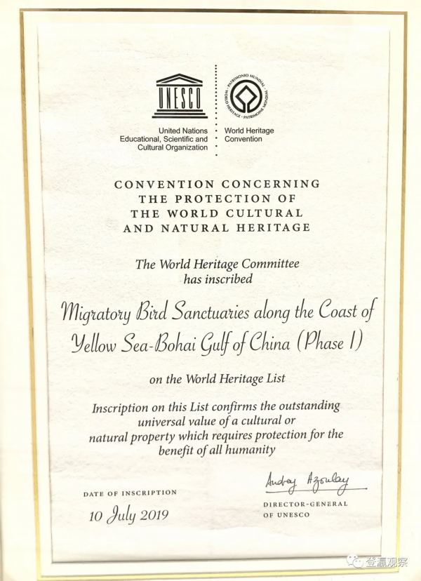 证书最上方印有“联合国教科文组织和《世界遗产公约》”的图文标志。正文内容大致分三部分,分别为:保护世界文化和自然遗产公约;世界遗产委员会同意,将中国黄(渤)海候鸟栖息地(第一期),列入联合国教科文组织《世界遗产名录》;列入《世界遗产名录》意味着明确该遗产具有的突出普遍价值,需要全人类共同保护。证书落款时间为2019年7月10日;签发人为联合国教科文组织总干事奥德蕾·阿祖莱。