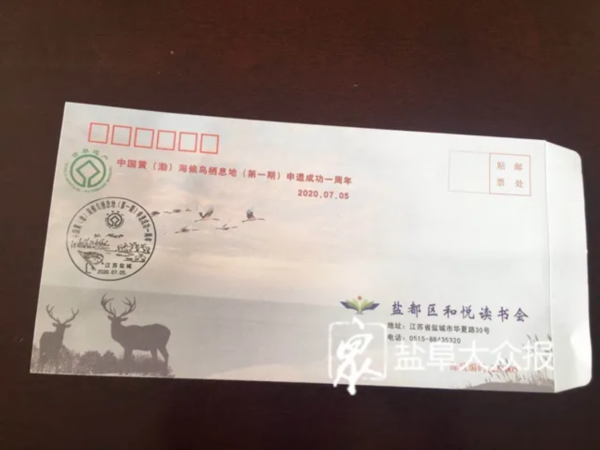 同日,黄海湿地申遗纪念封举办首发仪式。并组织文化志愿者分赴东台市、大丰区等地邮政支局进行实地盖戳,形成浓厚的知晓世遗、爱护世遗、融入世遗氛围。 为纪念并展现盐城黄海湿地的独特魅力,此次由盐都区图书馆开发的文创产品——中国黄(渤)海候鸟栖息地(第一期)申遗成功纪念封,在图案设计上融入不少盐城元素,比如麋鹿、丹顶鹤以及在江苏盐城国家级珍禽自然保护区条子泥段发现的极危物种——勺嘴鹬。 据介绍,设计理念是将天上飞的丹顶鹤,地上跑的麋鹿,水里游的中华鲟等有机融入作品中。同时将传统元素和时尚元素相结合,形成符合当代审美的创意产品,弘扬盐城黄海湿地文化。