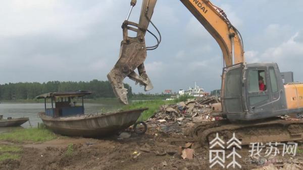 “三无船”指的是“无船名船号、无船籍港、无船舶证书”的船舶,由于体积较小,管控难度高,一旦违法航行、随意停靠,将严重扰乱内河通航秩序,危害水上交通安全。 7月7日,记者在位于镇江金山湖长江引航道枢纽的江海之门看到,两台挖掘机正同步作业,对已登记的“三无”船舶实施拆解。润州区拆解点的负责人介绍,经过前期摸排,在该区登记建档的 “三无船”共416艘,完成拆解或处置的船舶133艘,驱离非镇江籍的7艘。