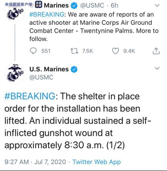 美国当地时间7月7日上午,美国海军陆战队通过社交媒体发布信息称,位于加州洛杉矶以东约200公里处,二十九棕榈海军陆战队空中地面作战中心基地(为美国海军陆战队最大的基地)于当天清晨6点30分左右发生枪击事件,并宣布该区域进入封锁状态。而当地执法部门圣贝纳迪诺县警察局也接到此次枪击事件的信息,但警方被告知由于枪击案发生在军事基地内,暂不需要警方介入。随后军方再次通过社交媒体发布信息称,军事基地内一名人士持枪将自己打伤,随后被送往医院治疗。