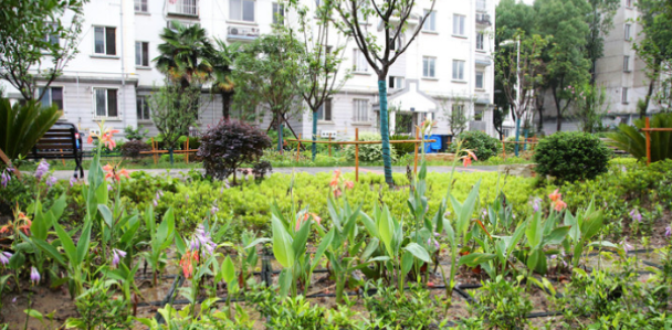 在丰乐公寓一期、二期的中心广场与生态停车场可以看到,三四千块透水砖代替了普通砖块,雨水直接渗透比路面排水效率高多了。37座雨水花园汇聚吸收雨水,并通过植物、沙土的综合作用使其净化,实现水循环。过去,丰乐公寓不仅易涝,还存在雨污管网混接、绿植退化等环境问题。