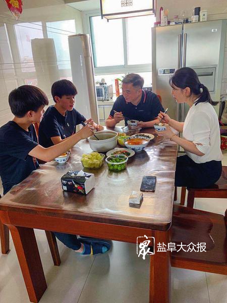 谢海云和丈夫陈兵在饭桌上与儿子们交谈。